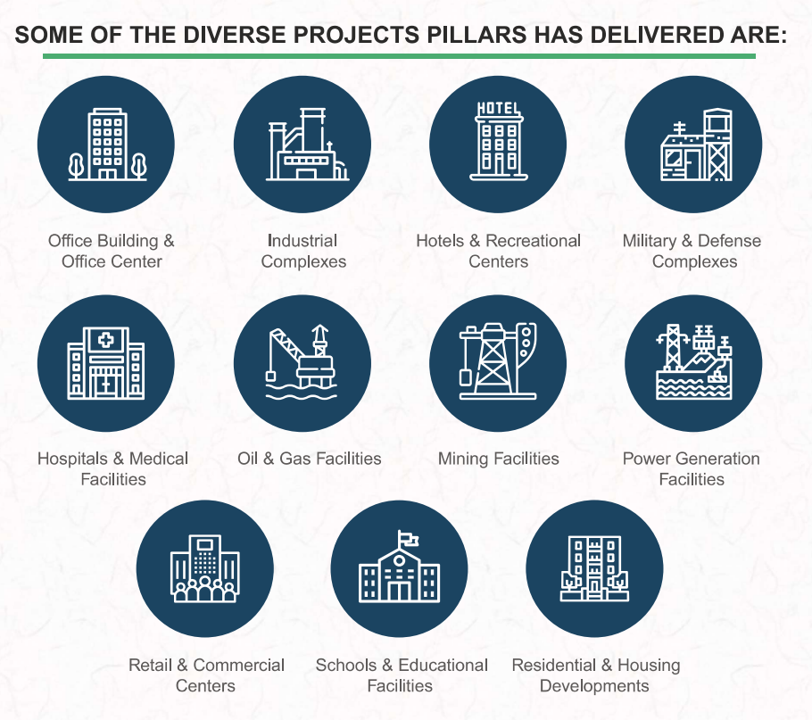 Genaral Contracting :- Pillars expertise encompasses the construction of a wide variety of projects, including office buildings, retail and commercial centers, housing developments, airports, metro station, railway, roads bridge, highrise towers, plants, power stations, sub-stations, factories, warehouses, logistics parks, cold stores, e-commerce stores, cement, electric, electronics, & ceramic factories, food, agro & dairy products factories, industrial complexes, hospitals, and medical facilities, military and defense projects, hotels, schools, and educational facilities, as well as storage and warehousing projects.